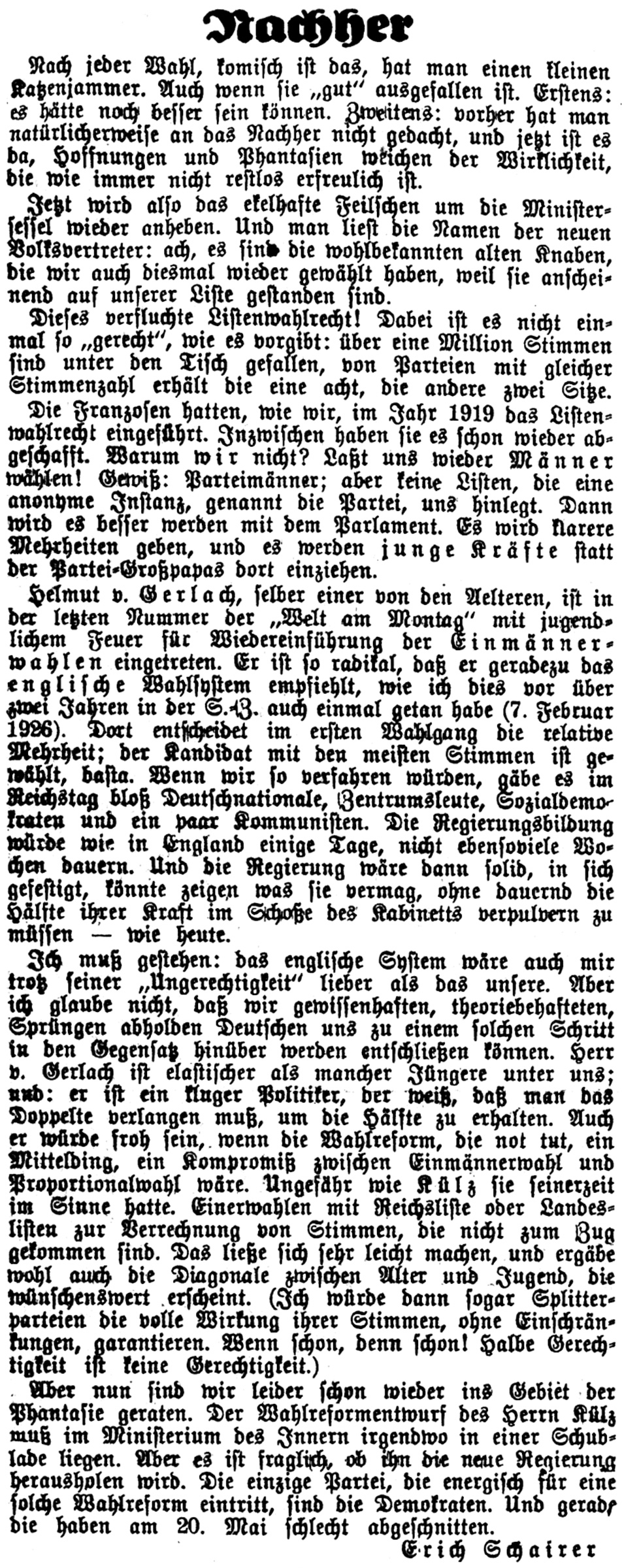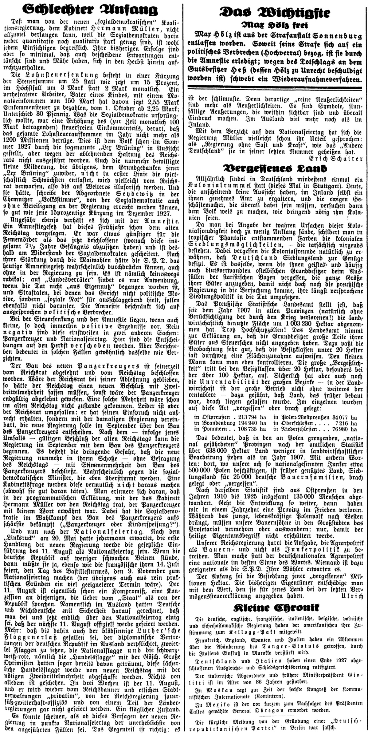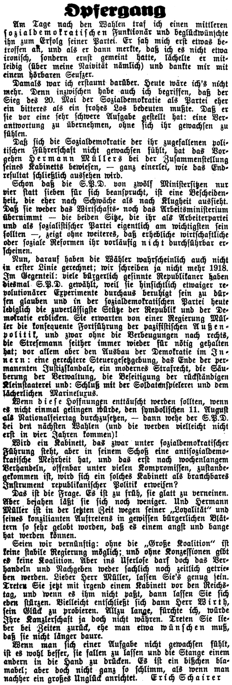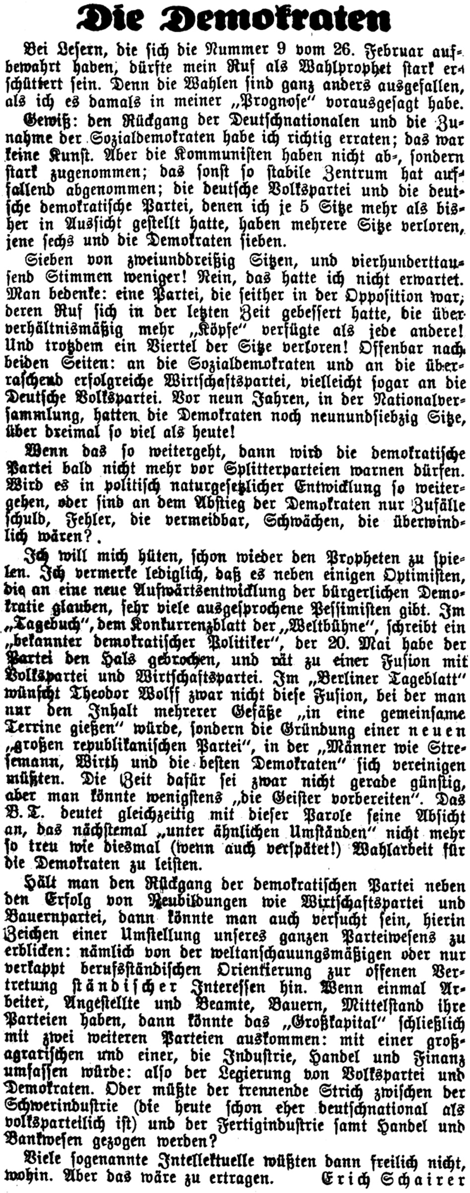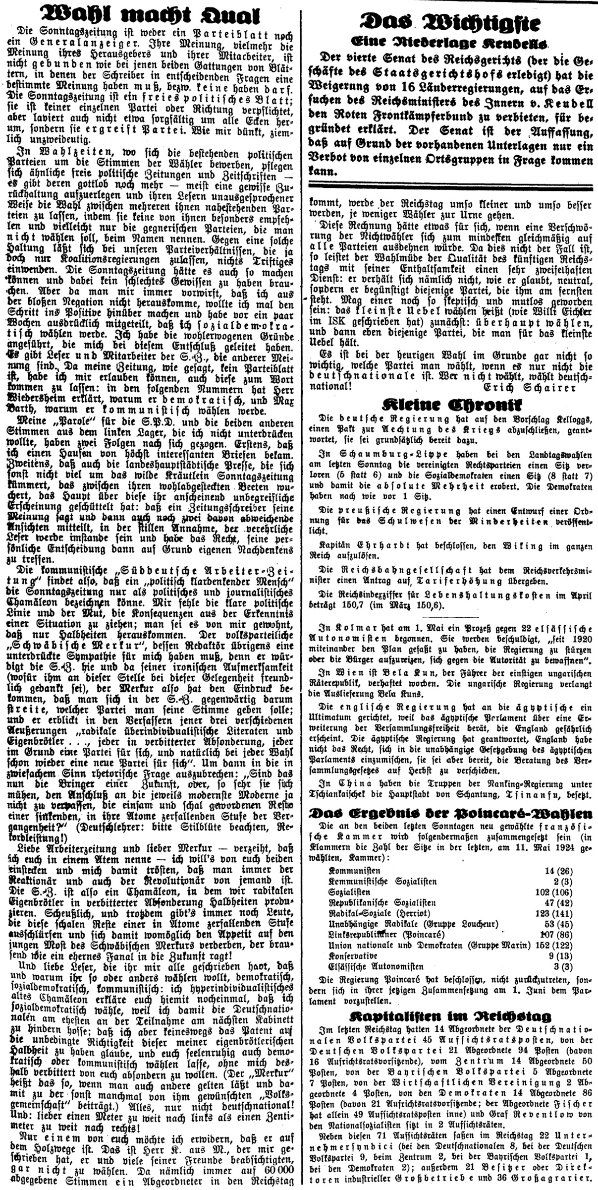 20. Mai: Reichstagswahlen in Deutschland: Verluste der DNVP (von 20.5 auf 14,3 %) und der liberalen Parteien; Stimmengewinne der SPD (von 26,0 % auf 29,8 %).