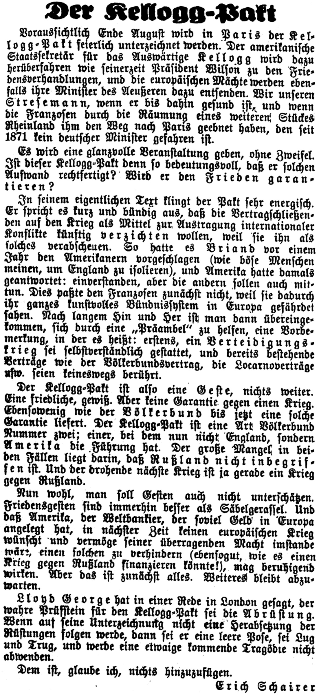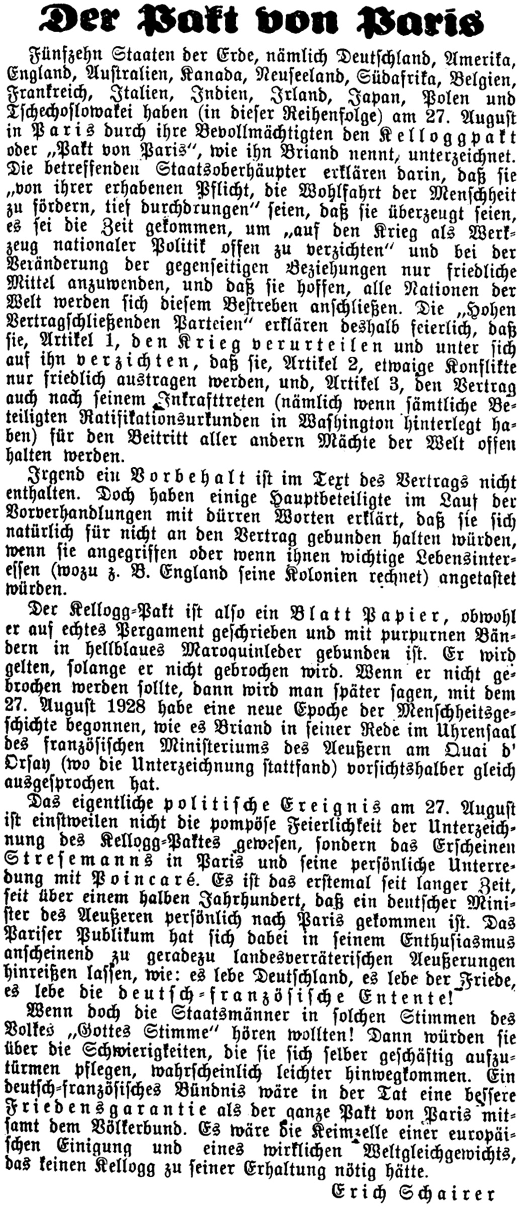 27. August: In Paris wird der Briand-Kellogg-Pakt unterzeichnet, der Kriege als Mittel der Politik ablehnt.