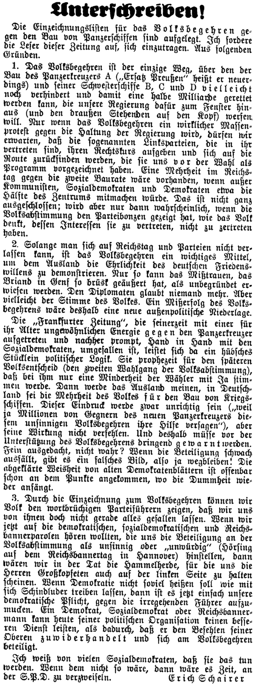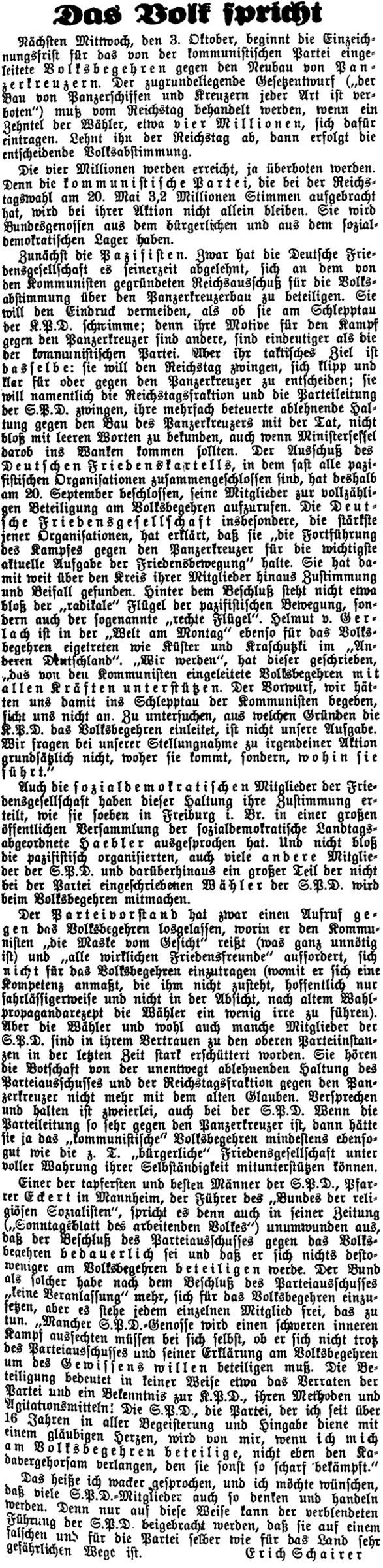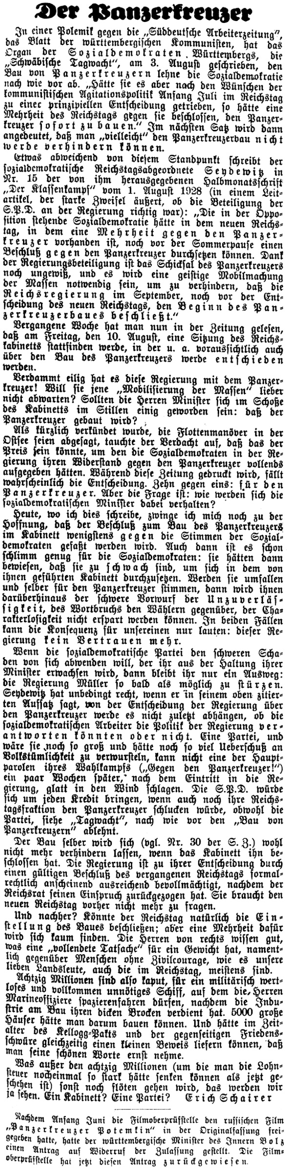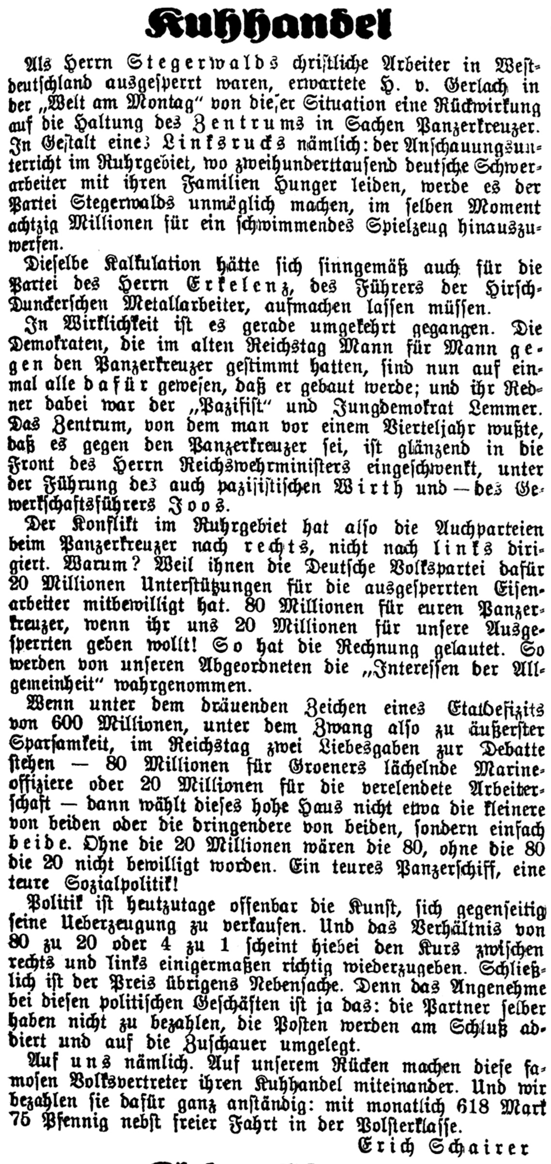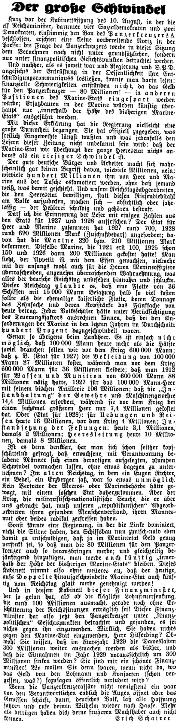 30. März: Der deutsche Reichstag beschließt gegen die Stimmen von SPD und KPD ein Kriegsschiffbau-Programm, etwa zehn Millionen Mark werden bewilligt. Im Wahlkampf bricht ein Proteststurm los (»Kinderspeisung statt Panzerkreuzer!«)[1]